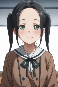 Kawabata Mayu 1girl, solo, looking at viewer, blush, smile, black hair, twintails, green eyes
