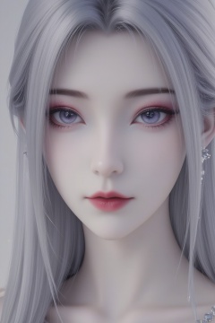 An eye-level perspective, a close-up of a woman's face, is depicted in a 3D monochromatic fashion. The woman's lips are painted a vibrant shade of pink, and her eyes are adorned with black eyelashes. Her hair, a light gray, is cascading down her shoulders, framing her face. She is wearing a necklace around her neck, adding a touch of charm to the scene.