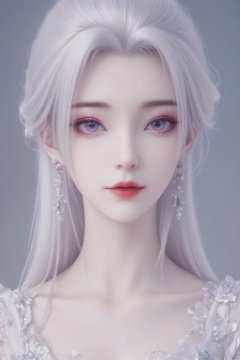 1girl, solo, jewelry, closed mouth, white hair, earrings, necklace, lips, eyelashes, makeup, lipstick, pale skin, portrait, close-up, red lips