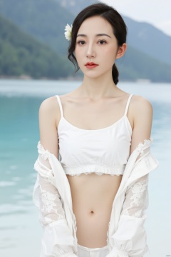 She wears a small white flower in her hair. She was standing in front of a body of water