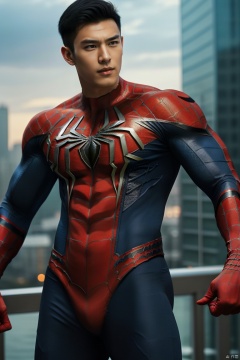 jzns,1man,spiderman,male focus,asian,exquisite facial features,handsome,muscular,spiderman  clothes,Dynamic pose, romantic realism, atmospheric, perfect city background, magnificent,masterpiece, realistic, best quality, highly detailed,profession