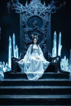 score_9,score_8_up,score_7_up,score_6_up,score_5_up,hanfu,wide sleeves,long sleeves,sleeves past fingers,see-through,hair stick,hair ornament,gufenghuanjing,indoors,1girl,long hair,solo,sitting,(crystal throne:1.2),ice throne,stairs,fantasy,china traditional palace,dated,(dark theme:1.3),(dark:1.6),wide_shot,