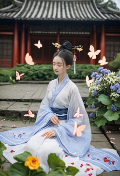 score_9,score_8_up,score_7_up,score_6_up,score_5_up,score_4_up,hanfu,wide sleeves,long sleeves,sleeves past fingers,see-through,hair stick,hair ornament, In a dreamlike garden akin to another world, a stunningly beautiful Chinese girl in pure white Hanfu dances gracefully amidst the fragrance-filled flora. Her Hanfu billows in the wind, as delicate as flower petals. The silk fan in her hands gently sways, attracting butterflies and bees to dance around her, making her seem like a goddess of the garden, in perfect harmony with the sea of flowers. Around the girl, blooms of every color vie to open, and she sits quietly in a pavilion, eyes closed, breathing in the gifts of nature. Her heart is enraptured by this piece of heaven and earth of her own creation