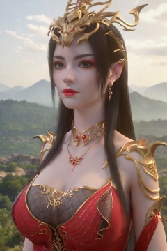 score_9,score_8_up,score_7_up,incredibly absurdres,<lora:SF_MeiDuShaHS_Pony-000005:0.7>,1girl,solo,red dress,large breasts,lips,jewelry,earring,long hair,looking at viewer,white background,landscape,