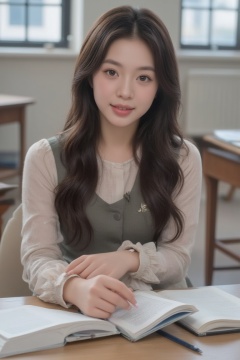 A close-up shot of a bright-eyed, curly-haired high school girl sitting at her desk in a sunlit classroom, surrounded by textbooks and pens. Her smile is warm and inviting as she looks directly at the camera, her hands clasped together in anticipation.