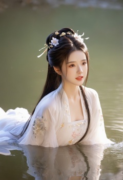hanfu,1girl, chinese clothes, long hair, solo, hair ornament, realistic, black hair, flower, dress, upper body, reflection, water, forehead mark, long sleeves, white dress, teeth, looking to the side, hair bun, brown hair, parted lips, facial mark, masterpiece,best quality,high-resolution image,High quality,Superb lighting,Highly detailed,Sharp focus,8K UHD,