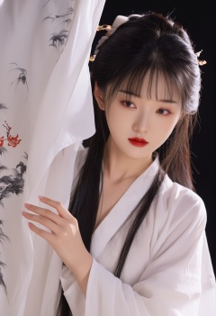 hanfu, jinghonghanfu, 1girl, black hair, solo, black eyes, long sleeves, parted lips, upper body, looking down, lips, hair ornament, long hair, white shirt, sleeves past wrists, paper, ink, black background, shirt, wide sleeves, red lips, bangs, realistic, masterpiece,best quality,high-resolution image,High quality,Superb lighting,Highly detailed,Sharp focus,8K UHD,