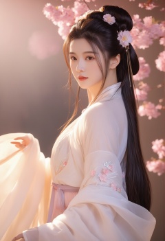 hanfu,1girl, long hair, solo, hair ornament, realistic, flower, upper body, hair flower, black hair, brown hair, dress, looking at viewer, chinese clothes, light, from side, long sleeves, hair bun, closed mouth, white dress, shawl, masterpiece,best quality,high-resolution image,High quality,Superb lighting,Highly detailed,Sharp focus,8K UHD,