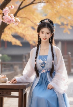 hanfu, jinghonghanfu, 1girl, jewelry, necklace, chinese clothes, solo, dress, hair ornament, black hair, realistic, blurry background, long hair, earrings, flower, looking at viewer, blurry, long sleeves, braid, tiara, brown hair, teeth, hair flower, tree, table, standing, outdoors, parted lips, blue dress, open mouth, masterpiece,best quality,high-resolution image,High quality,Superb lighting,Highly detailed,Sharp focus,8K UHD,