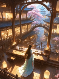 chaloujiusi,1girl,architecture,east asian architecture,long hair,solo,candle,scenery,table,from behind,cherry blossoms,lattice,dress,tree,lantern,standing,pagoda,railing,facing away,petals,black hair,wooden floor,building,indoors,sunlight,brown hair,chaloujiusi, scenery, multiple girls, lantern, multiple boys, 6+boys, 6+girls, stairs, tree, outdoors, from above, city, architecture, night, cityscape, railing, bridge, building, people, fantasy, <lora:chaloujiusi:0.8>,masterpiece,best quality,high-resolution image,High quality,Superb lighting,Highly detailed,Sharp focus,8K UHD,