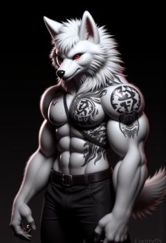 solo, furry anthro white wolf male, Yakuza style, detailed fur texture, (realistic face and red eyes), intricate tattoos, (yakuza symbol:1.4), (sharp claws), piercing gaze, dark background, masterpiece, (by F-R95, by Hioshiru, by einshelm),