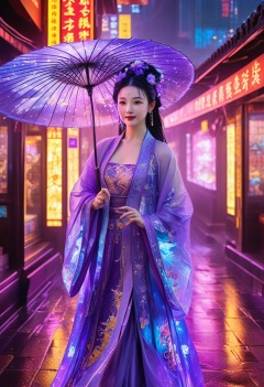 (Ultra realistic, intricate, Ultra high resolution masterpiece),(Amazing Primitivism Neuroaesthetic experiments art),(looking at viewer:1.2),(wet:1.3),detailed facial features,smile,The painting depicts an elegant beauty in ancient Chinese hanfu walking through a neon-lit cyberpunk cityscape. She wears an exquisite purple hanfu dress that flows gracefully with each step. The high-tech streets are bathed in the vibrant glow of holographic lights and animated signboards. Neon reflections dance across wet pavement slicked by recent rain. The maiden's porcelain features stand out amidst the dazzling city glow. Her jet black hair spills over one shoulder,partially obscuring the silk flower pinned above her ear. A parasol shields her from the environmental stimuli. Pedestrians give her curious glances as she passes serenely by in contrast to the bustling crowds. The glow of vending machines and flickering screens reflects in her dark,knowing eyes. Though the surrounding city pulses with chaotic energy,the maiden retains a vision of composure and classic beauty., masterpiece,best quality,high-resolution image,High quality,Superb lighting,Highly detailed,Sharp focus,8K UHD,