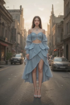 A cinematic photo of a stunning model dressed in light blue with open shoes, luxury dress, in the style of multi-layered textures, ornamental details, gothic core, highly detailed, photorealism, attractive and gorgeous beauty, while standing dominantly and confidently in a desolate place. , dark post-apocalyptic cityscape, capturing the stark juxtaposition of beauty and decay, with the model's perfect skin shining like a beacon of hope amidst the devastated cityscape. Photographed with a focused depth of field to blur the gloomy surroundings, emphasizing her striking, rebellious pose. full body, golden hour.
