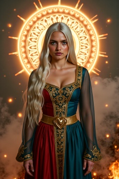 "A powerful and majestic woman stands against a mystical, glowing halo in the background. She has a striking face with pale, smooth skin and sharp, well-defined features. Her large, captivating blue eyes are the focal point of her face, framed by thick, dark lashes, and her arched eyebrows enhance her intense gaze. Her expression is serious and commanding, with slightly parted lips painted in a deep, bold red, exuding a sense of authority and mystique. Her long platinum blonde hair flows freely, caught in a breeze, creating soft waves that frame her face.