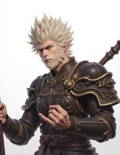 <lora:flux-lora-CNSHenHou.1:1>1boy, armor, beard, blonde hair, closed mouth, cnshenhou, facial hair, looking at viewer, male focus, scar, shoulder armor, solo, staff, upper body, white hair