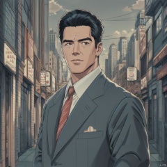 A man in the 1980s, dressed in a sharp suit with a slick back hairstyle, standing outside a bustling city street. He is framed in the foreground, with a vintage city bus in the background, adding to the retro atmosphere. The scene is bathed in the warm glow of the afternoon sun, casting long shadows on the urban landscape. The composition focuses on the man's confident pose and stylish attire, set against the vibrant city backdrop.