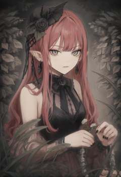 masterpiece, best quality,1girl, baobhan sith \(fate\), solo, long hair, pointy ears, hair ornament, grey eyes, looking at viewer, flower, hair flower, black flower, jewelry, earrings, pink hair, black rose, nail polish, breasts, upper body, rose  <lora:iwzryXLlokr4f-000140:0.95>