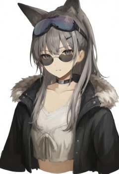 masterpiece, best quality,1girl, silver wolf \(honkai: star rail\), solo, grey hair, jacket, grey eyes, white background, looking at viewer, fur trim, eyewear on head, simple background, fur-trimmed jacket, hair between eyes, closed mouth, ponytail, crossed bangs, goggles on head, shirt, upper body, white shirt, long hair, hair ribbon, goggles, hair ornament, ribbon, choker, hairclip, tinted eyewear, portrait, drill hair, collarbone, cropped torso <lora:iwzryXLlokr4f-000140:0.95>