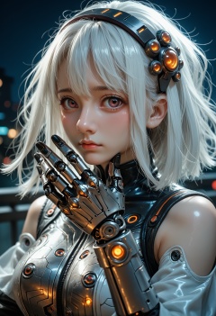 score_9,score_8_up,score_7_up,beast_quality,masterpiece,1girl,solo,looking at viewer,medium hair,bangs,hairband,purple eyes,hair ornament,hair between eyes,white hair,fluffy hair,large_breasts,blush shy,shiny_skin,very detailed clothes,very realistic textures,very detailed textures,longeyelashes,brown eye shadow,night,dim light,cyberpunk,mechanical arm,sci-fi style clothes,hair_tucking,metal material,realistic metallic texture,hands,raise your hand,