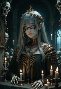 score_9,score_8_up,score_7_up,beast_quality,masterpiece, a dim scene,the walls of skeletons piled up,girl wearing black gauze,gold jewelry,turquoise eyes,gray long hair,air bangs,candlelight,