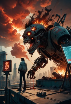 score_9,score_8_up,score_7_up,beast_quality,masterpiece,scary mechanical monster jumps to the roof,acupuncture of terror,gear,pipeline,red clouds,strange smoke,cyberpunk city,science fiction city,electric spark,explosion,damage,strange liquid,from_below,chest focus,