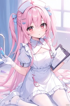 1girl, solo, long hair, looking at viewer, blush, bangs, hair ornament, red eyes, gloves, hat, dress, bow, ribbon, holding, hair between eyes, sitting, very long hair, pink hair, short sleeves, hair bow, pantyhose, frills, parted lips, shoes, hairclip, puffy sleeves, white gloves, pink eyes, white dress, two side up, puffy short sleeves, white headwear, wariza, white footwear, frilled dress, white pantyhose, nurse cap, nurse, syringe, clipboard, pill, holding syringe, holding clipboard, thermometer