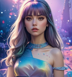 (fluorescent colors:1.4),(translucent:1.4),(retro filters:1.4), (fantasy:1.4), candy world Disney land ethereal soft fluffy soft landscape forest snowavatar Pastel pink sky green blue sparkle ethereal light pastel whimsical light rainbow stars diamonds sparkle gemstone background hyper realistic Ultra quality cinematic lighting immense detail Full hd painting Well lit,diagonal bangs, , collared dress,on side, masterpiece, best quality,realskin,(portrait:1.5), 1girl, blunt bangs, long hair