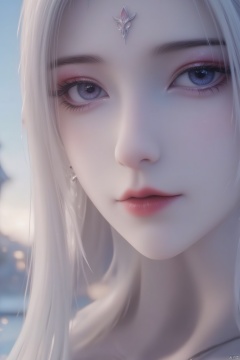 A close-up  a woman's mouth,white hair,blue eyes