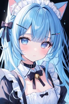 1girl, solo, long hair, looking at viewer, blush, bangs, blue eyes, simple background, hair ornament, white background, dress, bow, ribbon, animal ears, closed mouth, blue hair, upper body, frills, hairclip, cat ears, apron, black dress, collar, maid, maid headdress, sparkle, bell, detached collar, white apron, jingle bell, neck bell, maid apron, white collar