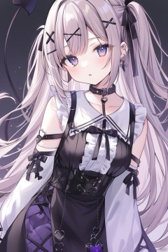 1girl, tail, demon_tail, hair_ornament, long_hair, hairclip, ribbon, black_ribbon, choker, earrings, x_hair_ornament, hair_ribbon, jewelry, solo