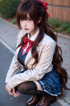 1girl solo long hair looking at viewer skirt brown hair long sleeves bow brown eyes school uniform full body outdoors shoes socks red bow blue skirt brown footwear squatting black socks loafers realistic