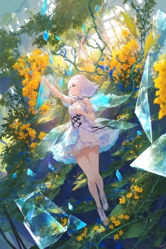 (masterpiece),(best quality),illustration,ultra detailed,hdr,Depth of field,(colorful),loli,yellow theme,the setting sun,Chamomile,Chamomile,cornflower,vines,forest,ruins,lens flare,hdr,Tyndall effect,damp,wet,1girl,bare shoulders,broken glass,broken wall,white hair,white dress,closed mouth,constel lation,flat color,braid,white robe,float,closed mouth,constel lation,flat color,looking up,standing,medium hair,standing,solo,