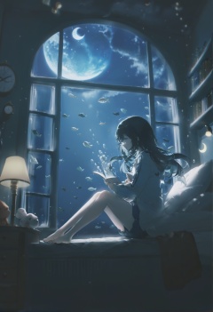 masterpiece,best quality, score_9,score_8,score_7_up,score_6_up,1girl, stuffed toy, stuffed animal, teddy bear, book, moon, bubble, bookshelf, bed, window, solo, crescent moon, bedroom, long hair, indoors, night, curtains, sitting, shorts, barefoot, black hair, fish, pillow, sky, blue theme, phone, on bed, shirt, star \(sky\), night sky, holding, bare legs, bag, shelf, lamp, underwater, cellphone, clock, smartphone, long sleeves, open book, jacket, open clothes, floating, scenery, air bubble, cloud, blue eyes, starry sky <lora:konyakarasueXLlokr4f-000140:0.95>