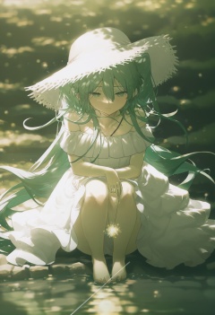 masterpiece,best quality, score_9,score_8,score_7_up,score_6_up,1girl, solo, hatsune miku, sparkler, dress, long hair, white dress, hat, aqua hair, bare shoulders, very long hair, hair between eyes, aqua eyes, holding fireworks, off-shoulder dress, barefoot <lora:konyakarasueXLlokr4f-000140:0.95>