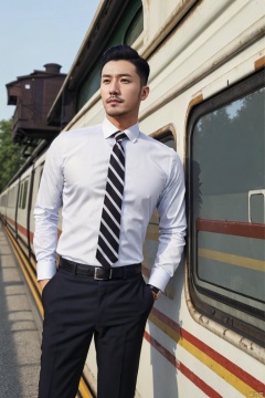 jzns,hzbz,1man,solo,asian,handsome,realistic,male focus, black pants, white shirt, wristwatch, holding clothes, belt, collared shirt,facial hair, outdoors, train, striped necktie, striped shirt, leaning against the train,(masterpiece,realistic,best quality,highly detailed),hzbz