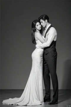 👫,a Handsome man and a sexy woman hugging together,standing,asian,exquisite facial features,formal,full body,Dynamic pose,romantic realism, atmospheric, award winning artwork,ink wash painting background, magnificent, masterpiece, realistic, best quality, highly detailed,profession, creative, glowing, dynamic,jzns,plns