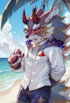 score_9, score_8_up, score_7_up, high quality, hires, solo, bael, housamo, tokyo afterschool summoners, furry, red sclera, shorts, glasses, shy, looking at viewer, beach, <lora:Bael_TAS_Housamo:1>, <lora:add-detail-xl:2>