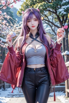 Masterpiece, best quality, high quality, (color) , full breasts, (purple hair: 1.3) , ((mixed realistic and illustrative elements style, surrounded by colored text“Jilin”:1.5) , a young woman, street clothes, holding mooncakes, stylish hats, gestures, smiles and happiness, illustrative elements of Mooncakes and rabbits, (standing in front of a tree covered with rime: 1.3) , a tree covered with snow, 4k, award-winning work, high, ultra-high definition, masterpiece, very aesthetic, very detailed