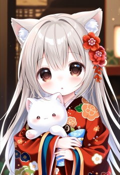 Elite,loli 1girl 1girl loli japanese clothes kimono animal ears animal long hair flower hair ornament red kimono hair flower animal ear fluff blush looking at viewer floral print bangs long sleeves solo upper body print kimono parted lips hair between eyes cat ears cat brown eyes red flower :o animal hug night holding animal grey hair wide sleeves blurry background,<lora:A401.1 XL 1.0:0.8>,