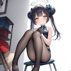 (masterpiece), (best quality), illustration, ultra detailed, hdr, depth of field, (colorful),loli,petite,cute, 1girl, solo, best quality, white background, simple background, grey background, full body, looking at viewer, blush, closed mouth, green eyes, long hair, black hair, butterfly hair ornament, twintails, bangs, double bun, side bun, china dress, black gloves, black dress, sleeveless dress, halo, bare shoulders, own hands together,Black Pantyhose,no shoes,Sitting on a chair,kisaki \(blue archive\),