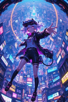 ,Cyberworld,cyber 1 girls,1girl,courier service, Floating in the air.,dj,tail,,100 drone,( random hair, random color eyes, shining eyes, silver hair,,modern girl,ultra detail,8k,near future,akihabara,,otaku boy,fisheye_lens,Very detailed,view from head-mounted display,vivid color,,neon city, cityscape,night,