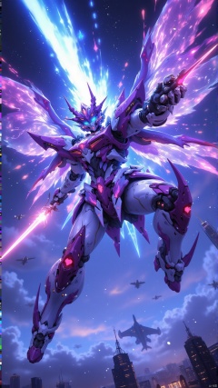 Digital art style,fantasy illustration, High quality,masterpiece,Mech Angel Mech Angel Wings Cyberpunk 1girl aircraft airplane city lights earth \(planet\) fighter jet galaxy holding holding sword holding weapon jet light particles mecha mecha muscle military military vehicle milky way plane science shooting sky solar space (sky cloud space), flowing light