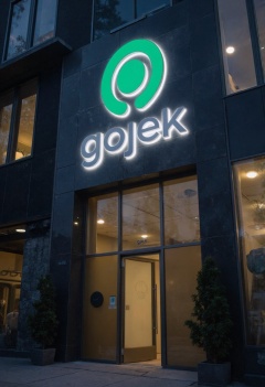 Capture the entrance of a modern office building with the g0jekl0go logo displayed on the exterior signage. The logo is illuminated, making a strong first impression on visitors as they approach the entrance