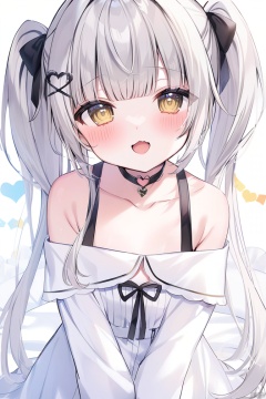 1girl, virtual_youtuber, long_hair, twintails, solo, heart, off_shoulder, open_mouth, blunt_bangs, blush, looking_at_viewer, bangs, yellow_eyes, grey_hair