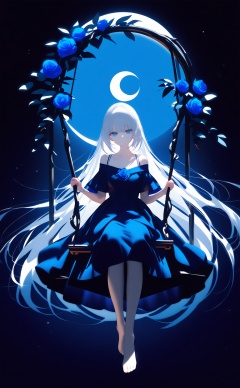 masterpiece,best quality,high quality,1girl,swing,dress,solo,flower,blue eyes,blue flower,long hair,blue dress,barefoot,sitting,white hair,looking at viewer,blue rose,blue theme,rose,swinging,moon,light particles,pale skin,blue background,vines,off shoulder,full body,expressionless,closed mouth,night,moonlight,collarbone,plant,crescent moon,very long hair,
