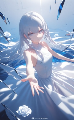 masterpiece,1girl,solo,long hair,dress,looking at viewer,white eyes,glass,grey eyes,white dress,white hair,broken glass,flower,white theme,bare shoulders,blue theme,dress flower,glass shards,white flower,reaching,reaching towards viewer,water,parted lips,closed mouth,sleeveless,reflection,sleeveless dress,white rose,watermark,expressionless,