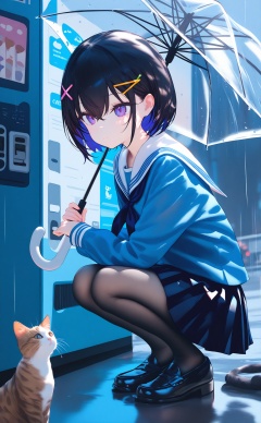 masterpiece,best quality,high quality,(colorful),loli,1girl,transparent,school uniform,rain,umbrella,cat,hair ornament,pantyhose,squatting,skirt,transparent umbrella,serafuku,holding,short hair,solo,purple eyes,black footwear,white sailor collar,outdoors,loafers,shoes,hairclip,sailor collar,x hair ornament,long sleeves,neckerchief,black hair,pleated skirt,bangs,holding umbrella,blue shirt,animal,shirt,blue serafuku,closed mouth,hair between eyes,black pantyhose,vending machine,blue skirt,black skirt,