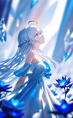 masterpiece,best quality,high quality,(colorful),1girl,flower,solo,dress,braid,looking up,blue flower,white dress,long hair,white hair,from side,blue eyes,bare shoulders,crying,blurry foreground,standing,blurry,sidelocks,crying with eyes open,blue theme,ahoge,tears,crystal,profile,depth of field,off shoulder,breasts,small breasts,off-shoulder dress,light,