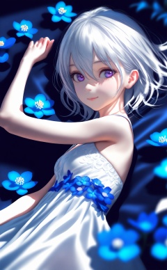 (masterpiece),(best quality),illustration,ultra detailed,hdr,Depth of field,(colorful),realistic,loli,1girl,solo,flower,dress,sleeveless,lying,white dress,looking at viewer,sleeveless dress,blue eyes,on back,closed mouth,bare shoulders,blue flower,hair between eyes,bare arms,smile,blue theme,white hair,short hair,hand up,medium hair,purple eyes,small breasts,from side,breasts,