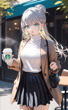 masterpiece,bestquality,crisp,line art,line style,depth of field,1girl,solo,skirt,long hair,holding cup,outdoors,street,cafe,looking at viewer,bangs,handbag,cafe,table,jewelry,earrings,disposable cup,long sleeves,tree,jacket,turtleneck sweater,pleated skirt,medium breast,grey hair,shoulder bag,hair bun,cowboy shot,steam,white sweater,open clothes,coffee cup,black skirt,open mouth,aqua eyes,blue nail,day,standing,ribbon,brown jacket,
